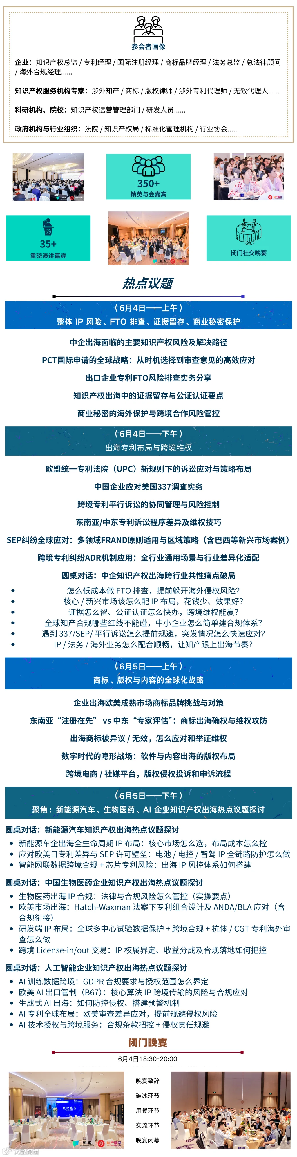 然而,全球各市场专利侵权判定规则差异显著、极具地域特殊性:美国337调查成为中企高频壁垒,裁决结果直接影响产品准入;欧盟统一专利法院(UPC)新规则下,诉讼程序与救济措施更趋复杂;东南亚实行「注册在先」原则,侵权认定严格遵循「全面覆盖」标准,且各国证据规则差异显著;中东普遍采用「专家评估制」,宗教文化与贸易政策更对维权流程形成隐性制约。正因对各国规则缺乏深度认知,中企频频遭遇专利布局适配不足、侵权风险预警滞后、维权举证困难、跨境纠纷解决低效等痛点,甚至因侵权争议被迫退出目标市场。在此背景下,由知闻咨询&知产荟萃主办的“中国企业知识产权出海发展论坛”,将于2026年6月4-5日在上海召开,论坛以「破局出海,知产领航」为主题,现诚挚邀请您拨冗出席,期待您的莅临!(知产荟萃→官微公众号,联系组委会查看详情)