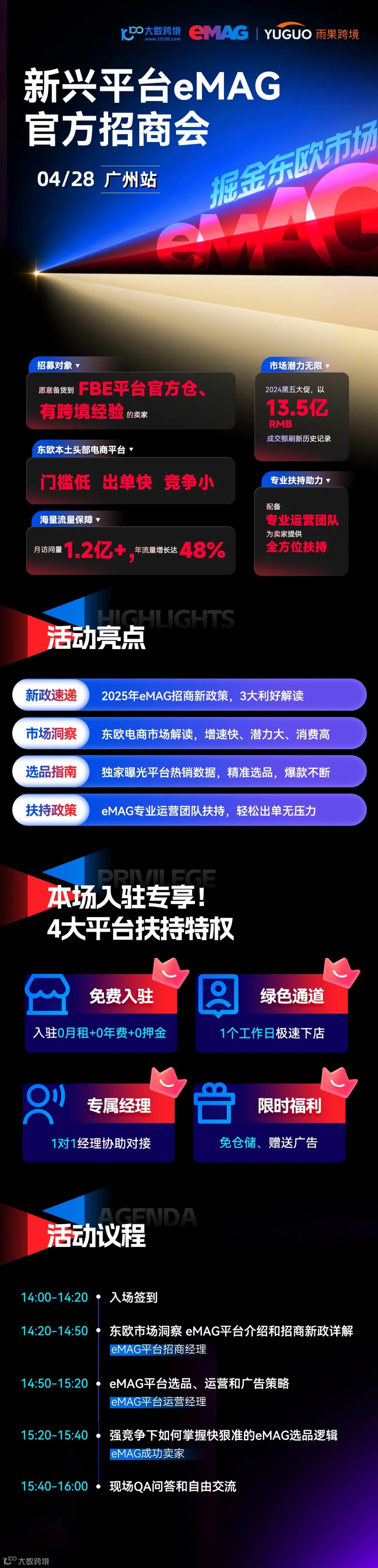💡eMAG 城市巡回沙龙・广州站重磅来袭! ✔️ 免费入驻:0 月租 + 0 年费 + 0 押金 ✔️极速下店:绿色通道 1 个工作日搞定 ✔️专属扶持:1 对 1 经理对接 + 免仓储 + 赠广告 🔔还有 2026 年 eMAG 招商新政、东欧市场数据、潜力选品指南全解析! ⏰ 4月 28 日 14:00 | 广州 提供免费停车