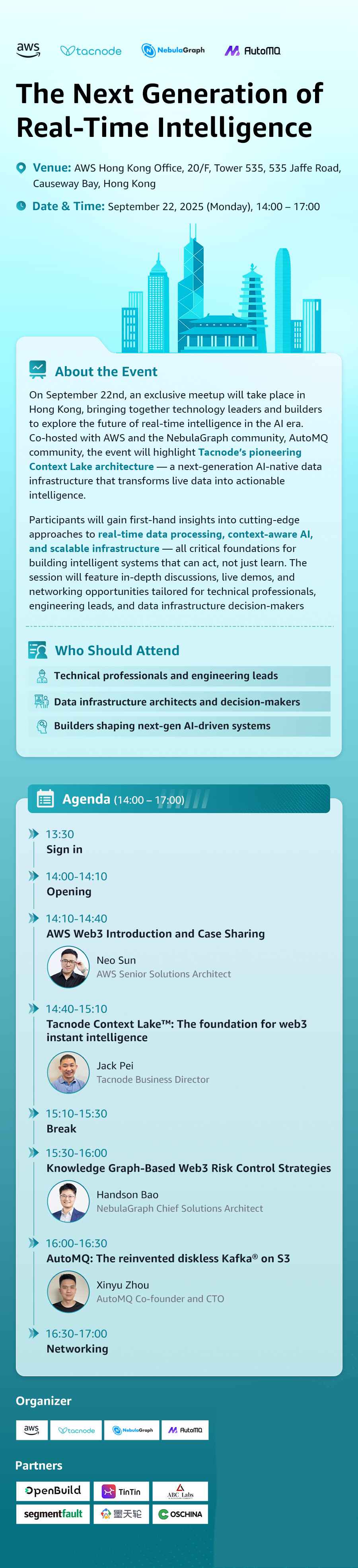 2025 年 9 月 22 日(周一),我们将在香港 AWS 办公室举办一场深度技术交流会,聚焦于 AI 时代的实时智能与数据基础设施演进,旨在为技术决策者、架构师和工程师提供一个交流与学习的平台。