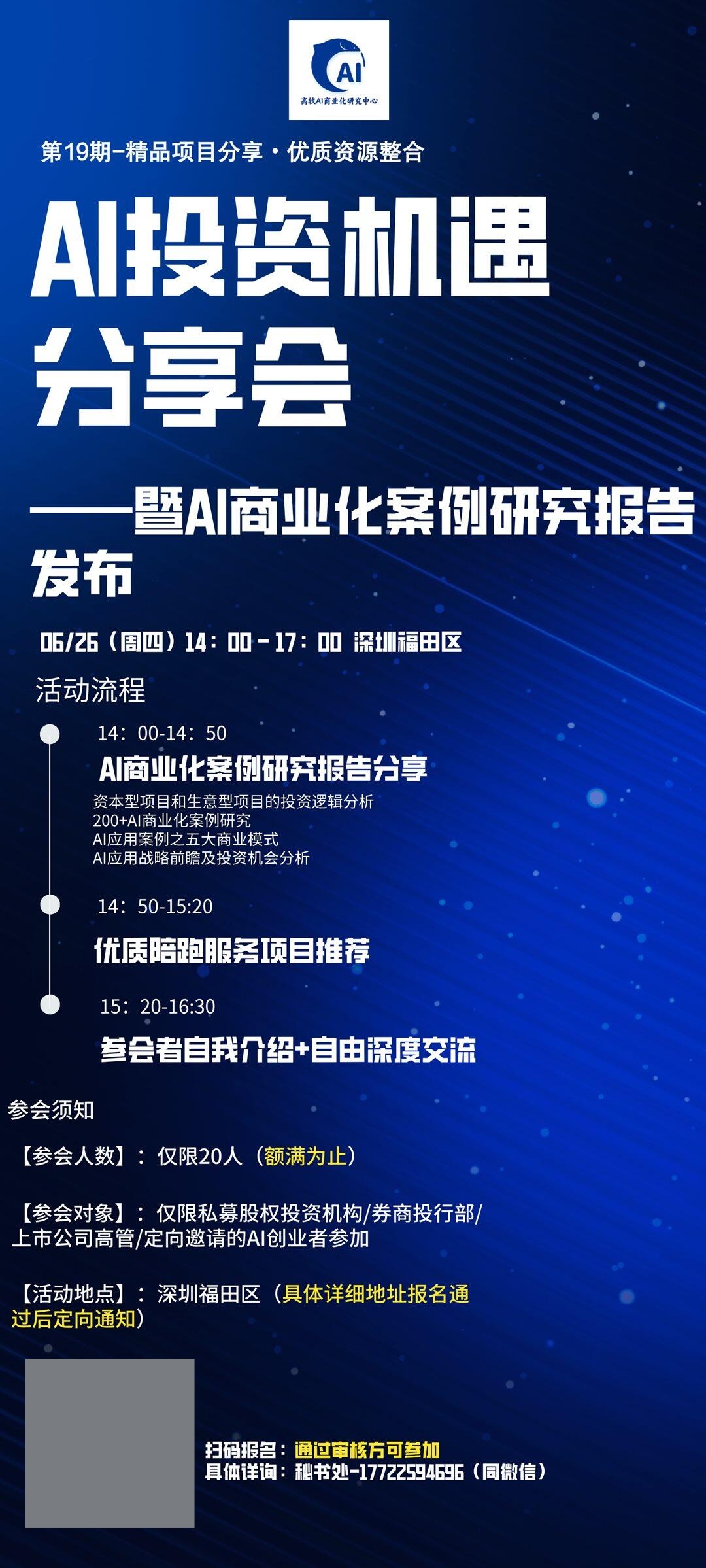 AI投资机遇分享会暨AI商业化研究报告发布(第19期·线下)-6月26日· 深圳福田