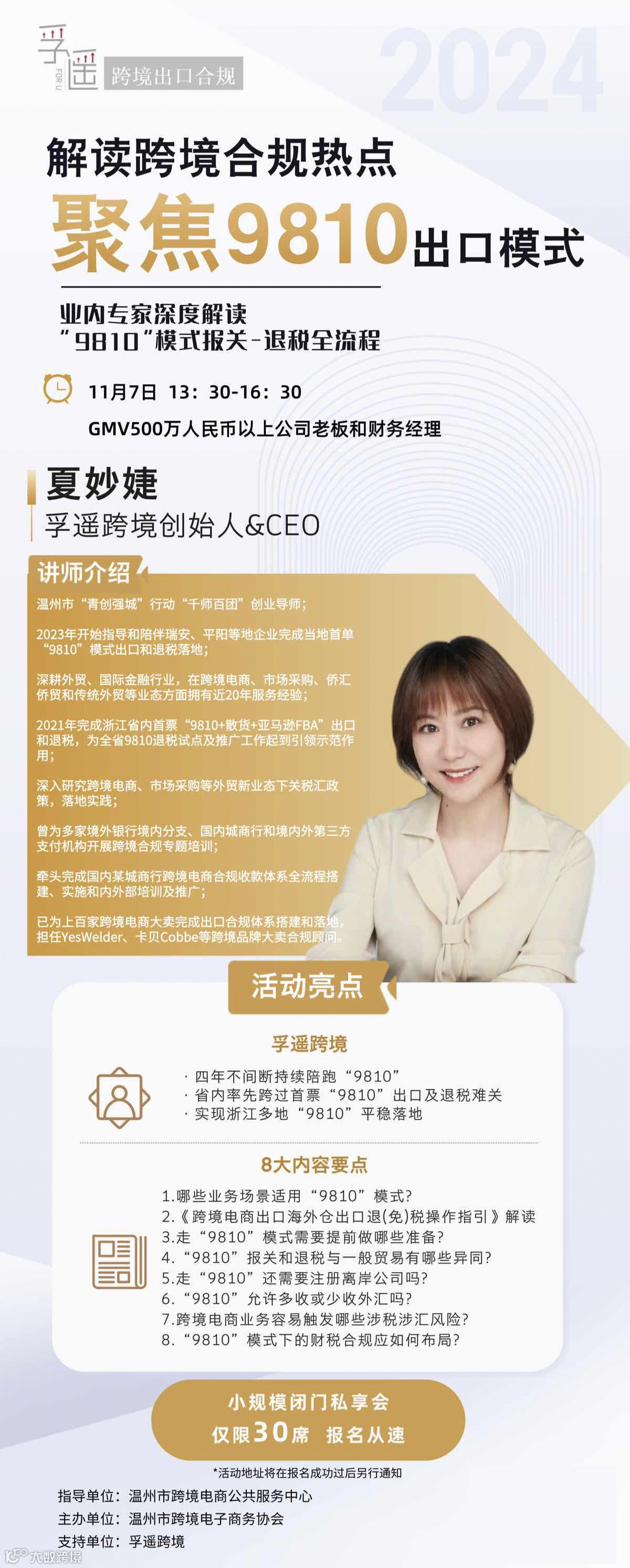 2023年开始指导和陪伴瑞安、平阳等地企业完成当地首单“9810”模式出口和退税落地,