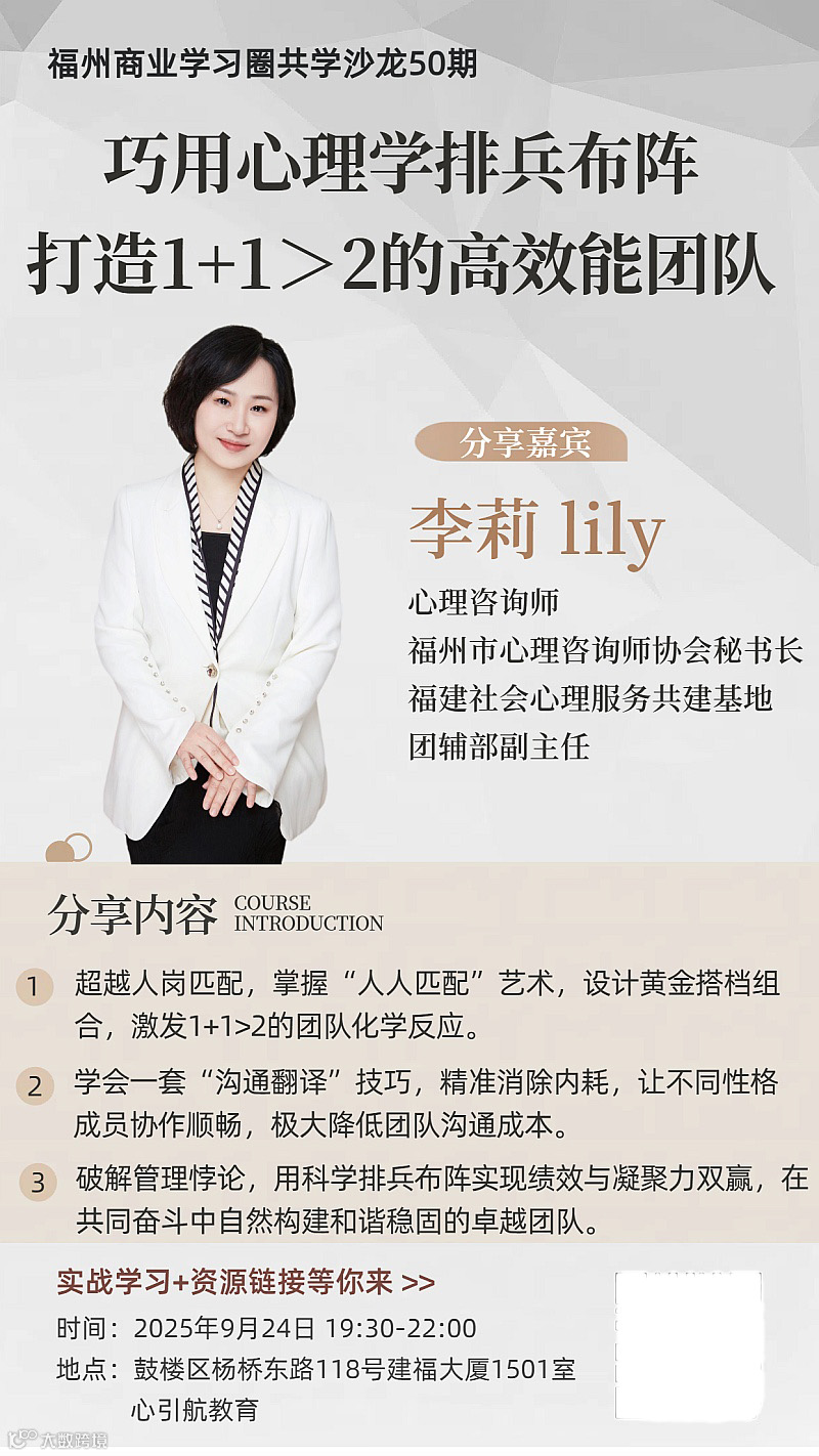 【共学沙龙】第50期:巧用心理学排兵布阵,打造1+1>2的高效能团队