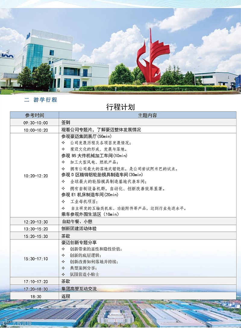 2、游学纪律:游学期间服从组织统一安排,不可单独逗留;参观企业期间需遵守企业规定,得到允许后方可进行拍摄录像,并保持安静有序参观。