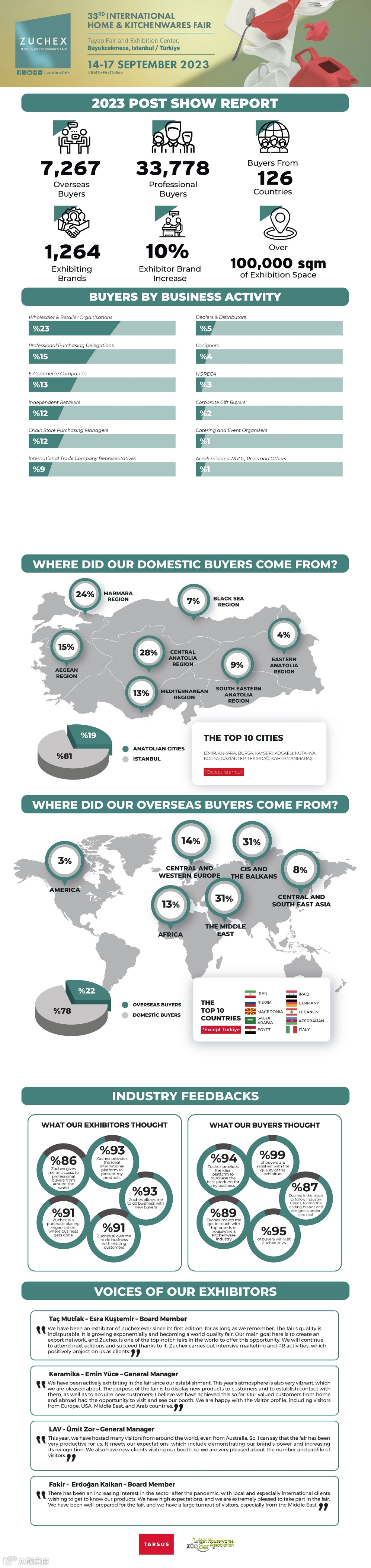 土耳其消费品礼品、家居用品及家电展Zuchex上届展览面积14万平方米,展商907家,分别来自中国、美国、俄罗斯、印度、巴西、西班牙、迪拜等,展商数量达到37,038人。来自美洲、欧洲、亚洲、非洲等90个国家和地区的超市、零售商、家电市场、百货公司、厨具店、装饰公司、批发商、代理商/分销商、酒店采购商等。