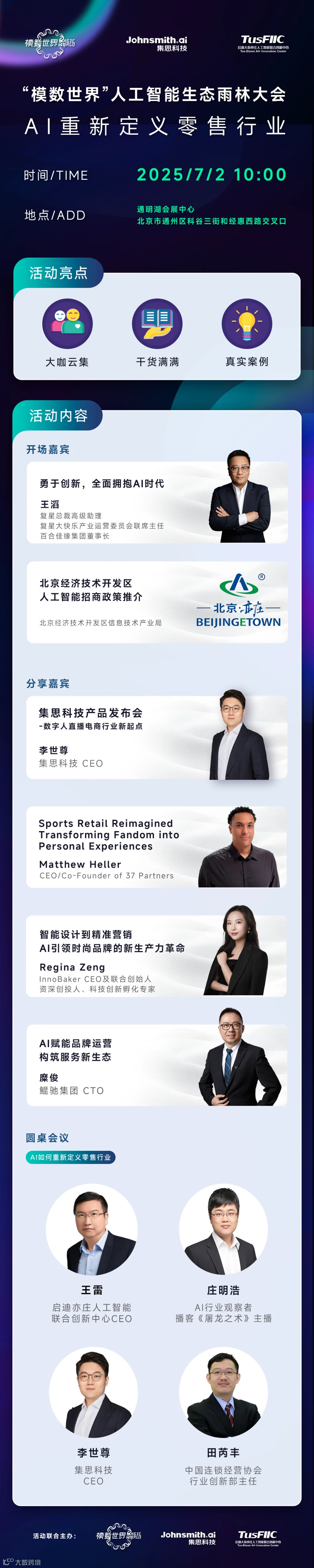 北京市人工智能孵化器“模数世界”将举办首届AI大会。在AI重塑商业的时代,我们即将开启一场关于零售行业未来的深度对话!诚邀您莅临“模数世界”人工智能生态雨林大会-AI与零售行业的碰撞,与行业领袖、技术先锋共同探索AI与零售的无限可能。