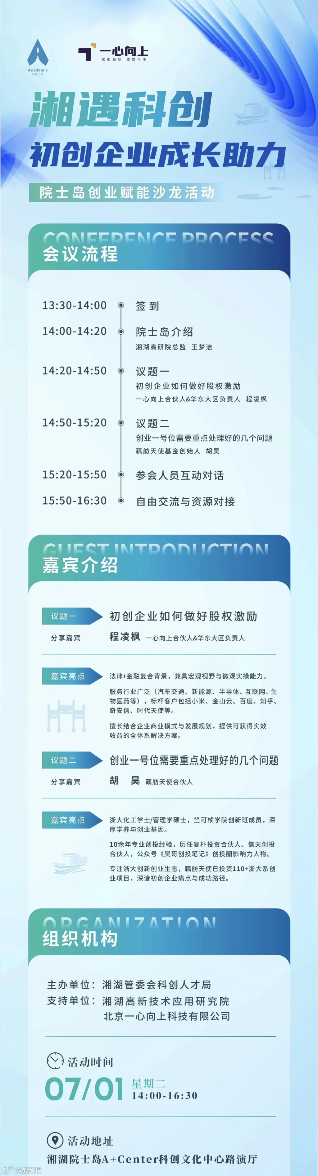 7月1日,由湘湖管委会科创人才局主办、湘湖高新技术应用研究院和北京一心向上科技有限公司承办的创业赋能沙龙活动将在湘湖院士岛A+Center科创文化中心路演厅开展。