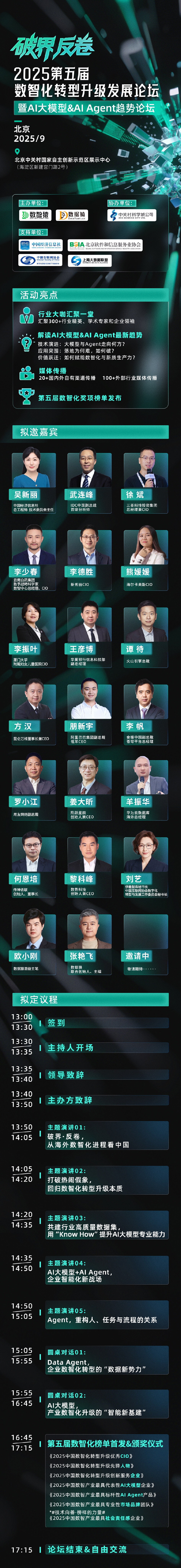 所以,由数智猿×数据猿联合主办,新华社中国经济信息社×中国互联网协会数字化转型与发展工作委员会×上海大数据联盟作为支持单位的的“2025第五届数智化转型升级发展论坛——暨AI大模型&AI Agent趋势论坛”,将本次活动主题定为“破界·反卷”,旨在通过打破技术与思维的边界,从对抗内耗式竞争的存量争夺,转向价值创新式的增量创造,良性推进“企业的转型与产业的升级”。