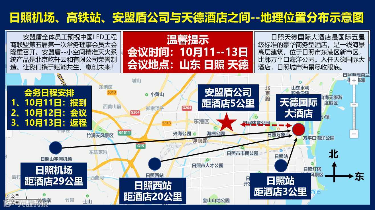 注:后附日照机场、高铁站、安盟盾公司与天德国际酒店之间的地理位置分布示意图。