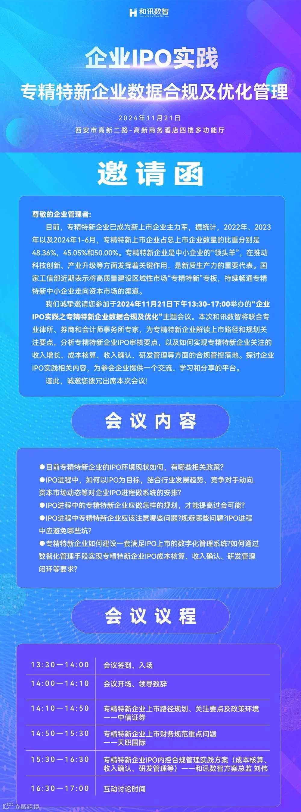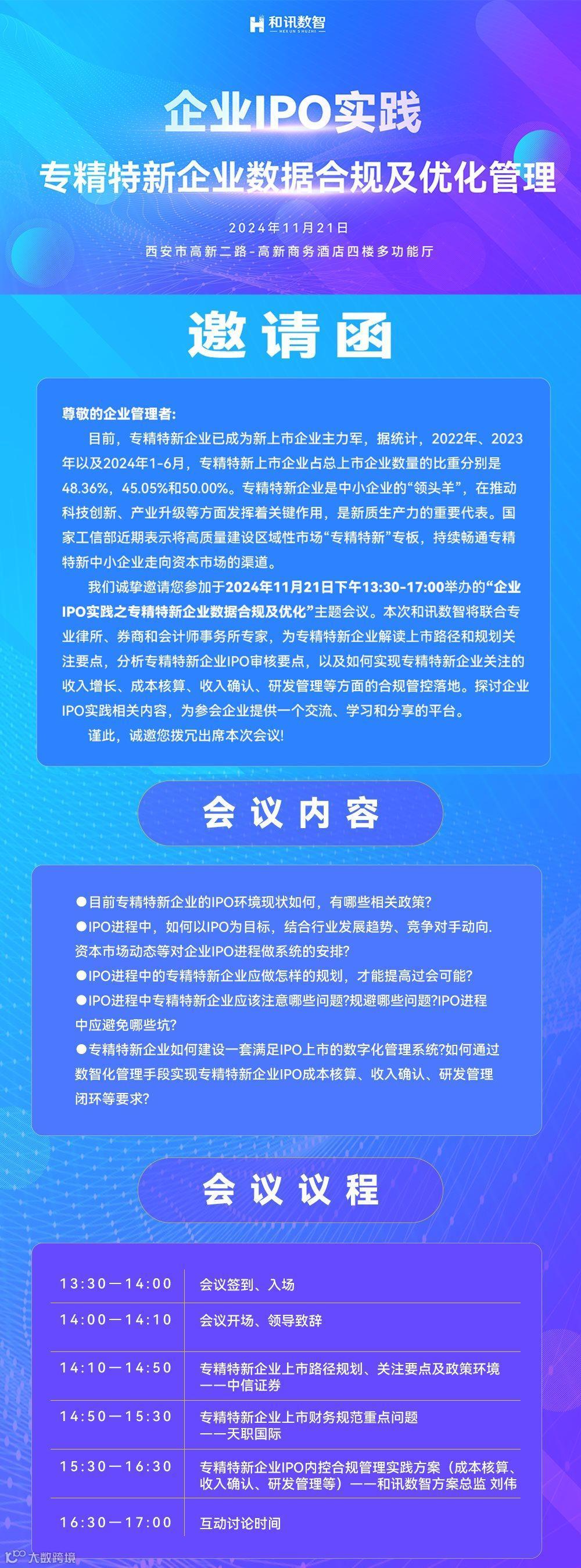 我们诚挚邀请您参加于2024年11月21日下午13:30-17:00举办的“企业IPO实践之专精特新企业数据合规及优化”主题会议。本次和讯数智将联合专业律所、券商和会计师事务所专家,为专精特新企业解读上市路径和规划关注要点,分析专精特新企业IPO审核要点,以及如何实现专精特新企业关注的收入增长、成本核算、收入确认、研发管理等方面的合规管控落地。探讨企业IPO实践相关内容,为参会企业提供一个交流、学习和分享的平台。
