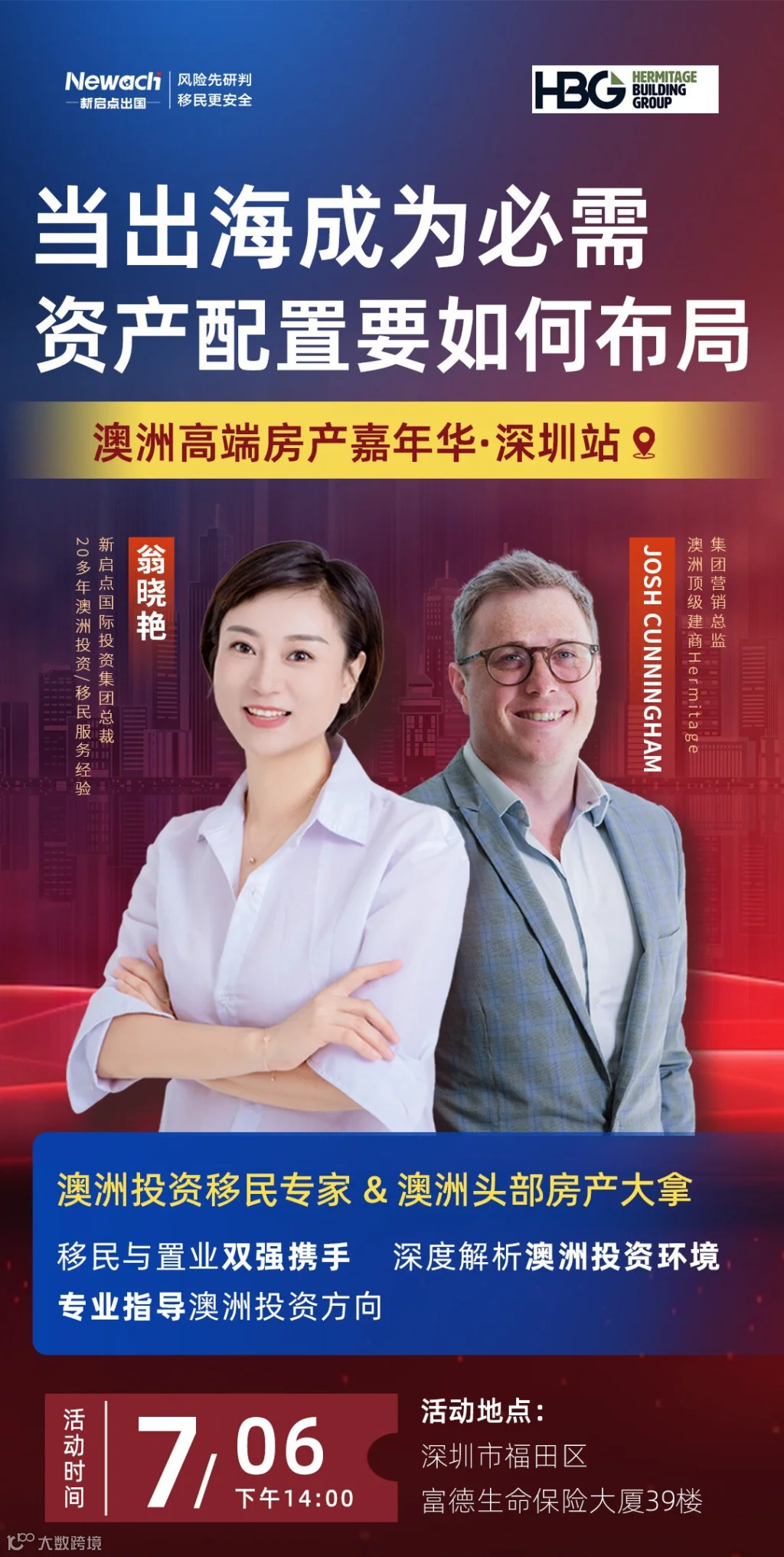 【全球资产配置盛会】探讨出海背景下的财富增值秘籍!聚焦澳洲最新市场动态,揭秘全球化趋势下资产配置的黄金法则。专为考虑移民的高净值人群及规划海外拓展的企业家量身打造。洞见市场先机,布局全球资产,有效应对变化,实现财富稳健增长与风险精准管理。名额有限,速来抢占席位,共赴财富之旅!