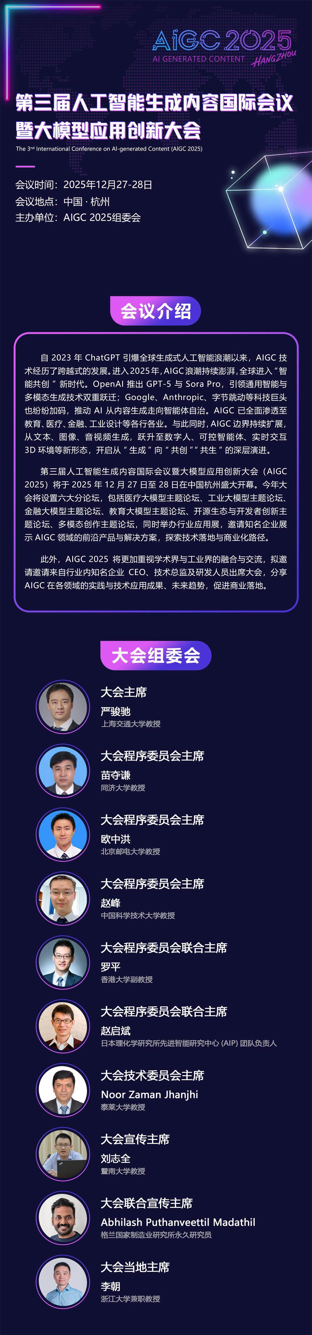 我们诚挚邀请来自全球的专家学者、科研人员、企业代表和学生参加AIGC 2025,共同探讨自然语言处理、图像与视频生成、机器学习、多模态建模等方向的最新成果,携手推动生成式AI的发展与应用,共赴内容智能化的未来。