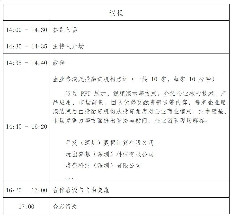1、投融资机构:邀请 10 家福田区知名投融资机构代表,每家机构 1-2 人,涵盖风险投资、私募股权等领域,熟悉 AI行业投资。