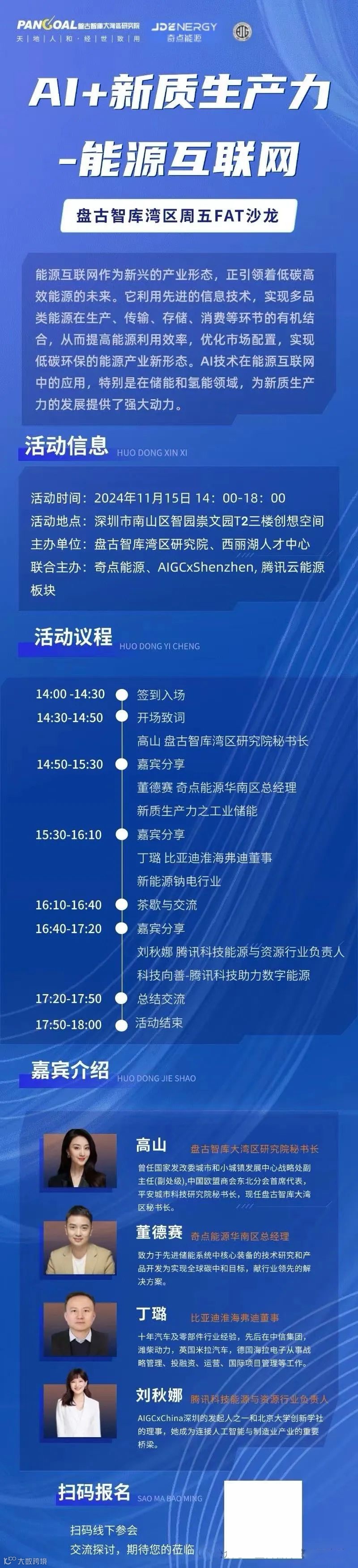 当 AI 遇上能源互联网,新质生产力的火花将如何绽放?在这场沙龙中,我们将深入探讨二者融合带来的无限可能。行业大咖齐聚,共同剖析前沿趋势,分享创新实践,为您揭开能源互联网推动新质生产力发展的神秘面纱。11 月 15 日,与我们一同踏上这场探索之旅,领略未来能源与科技交融的魅力!