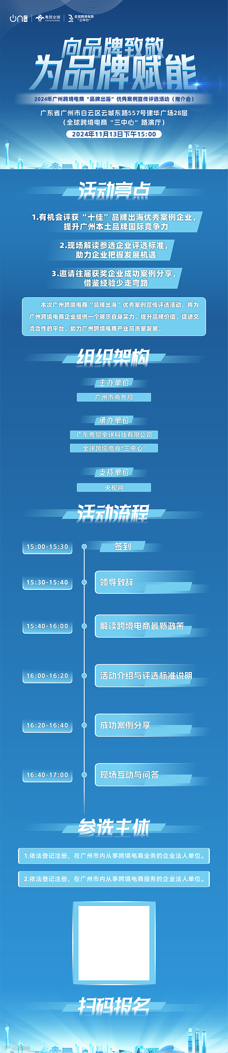 本次活动将设置“运营企业类”和“服务企业类”两个评选赛道,最终评选出2024广州市跨境电商“品牌出海”十佳运营案例及优秀案例、2024广州市跨境电商“品牌出海”十佳服务案例及优秀案例。