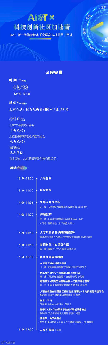 “AIoT×”项目路演系列活动是社区重点工作内容,聚焦AIoT不同领域、不同赛道,汇聚相应领域的专业投资人、行业专家与优质科创项目,通过路演的形式,搭建AIoT科创项目创新服务平台,帮助企业解决面临发展瓶颈及问题,助力企业创新发展。本期路演活动将聚焦人才项目需求,精选新一代信息技术领域具有创新活力的创业项目展示路演,并与相关目负责人现场交流对接,助力相关项目活动人才资金支持,推动项目落地。