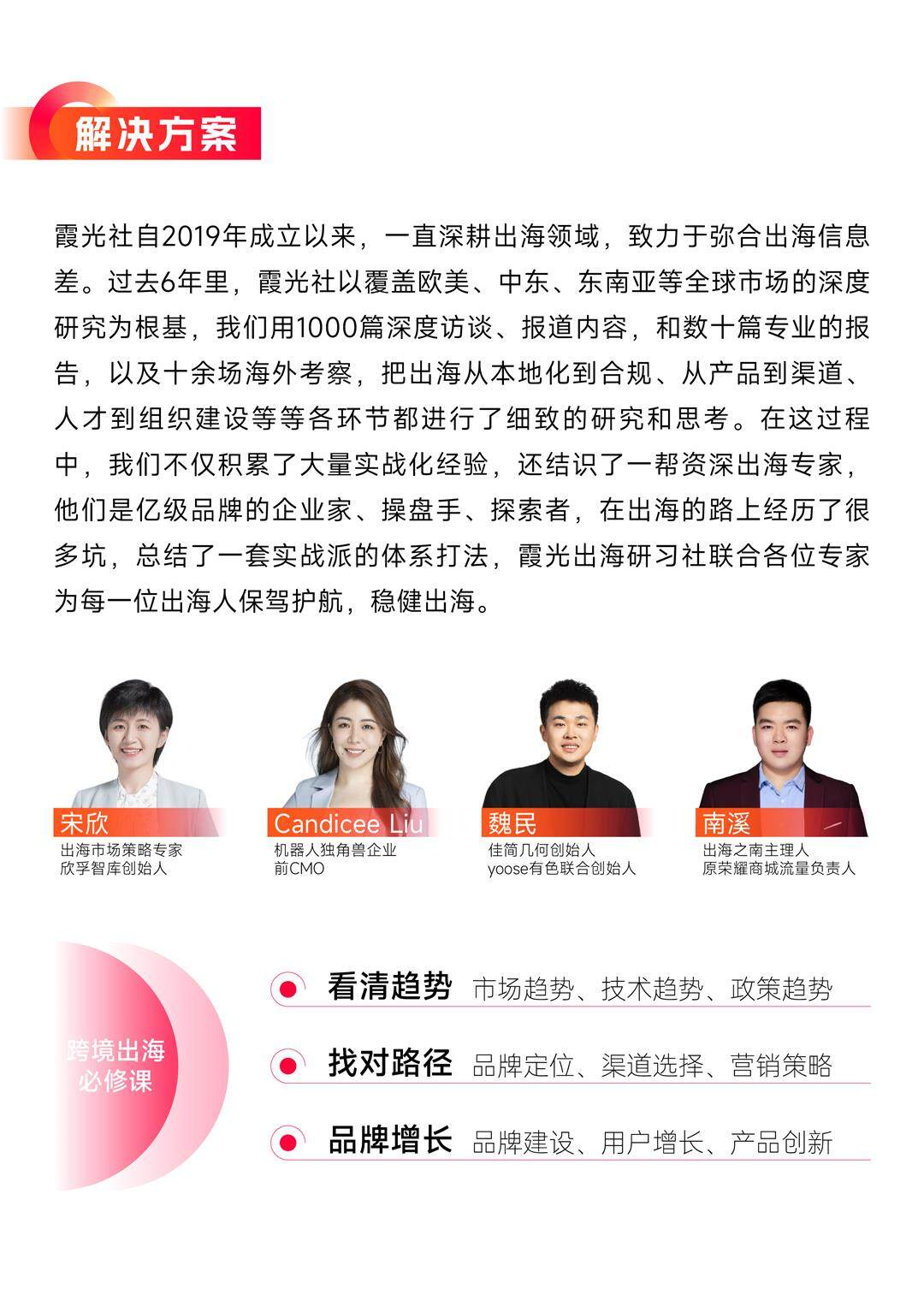 霞光社自2019年成立以来,一直深耕出海领域,致力于弥合出海信息差。过去6年里,霞光社以覆盖欧美、中东、东南亚等全球市场的深度研究为根基,我们用1000篇深度访谈、报道内容,和数十篇专业的报告,以及十余场海外考察,把出海从本地化到合规、从产品到渠道、人才到组织建设等等各环节都进行了细致的研究和思考。在这过程中,我们不仅积累了大量实战化经验,还结识了一帮资深出海专家,他们是亿级品牌的企业家、操盘手、探索者,在出海的路上经历了很多坑,总结了一套实战派的体系打法,霞光出海研习社联合各位专家为每一位出海人保驾护航,稳健出海。