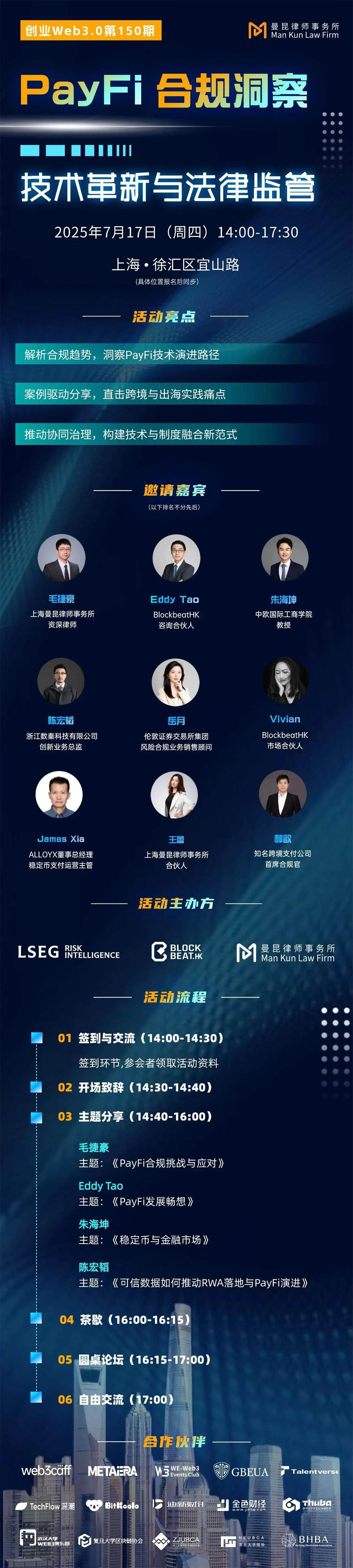 7月17日,曼昆律所联合伦敦证券交易所集团(LSEG)、Blockbeat HK,发起主题为“PayFi合规洞察:技术革新与法律监管”的行业闭门沙龙,聚焦技术、政策与场景落地三大核心问题。
