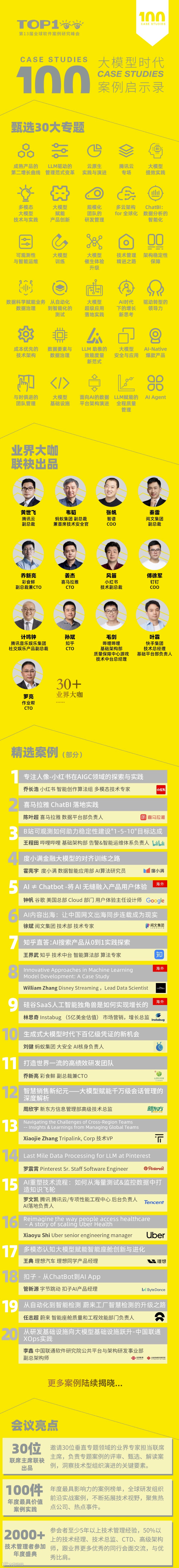 全球软件案例研究峰会(简称“壹佰案例”)是科技界一年一度的案例研究榜 单,旨在发现有案例教学意义的项目或方法论,如同商业领域的哈佛案例, 科技界的壹佰案例榜单每年精选100件案例题材,有别于媒体的追逐热点和 新奇概念,壹佰案例榜单更崇尚专业的力量和案例落地实践,通过邀请国内 外享誉盛名的专家、各大公司技术委员会与设计委员会负责人担任联席主席,向领先公司和早期实践者征集年度里程碑或杰出成果背后的案例故事,通过 组委会提供的案例开发流程、案例评审机制,以及数字化案例评审平台,帮 助案例提交者从案例目标、成功要点与背后教训、ROI 分析、案例启示、案 例对组织的意义等多个维度进行结构化提炼,从而达到让听众有所收益的目的,保证了每年发布的壹佰案例学习榜单是最有学习价值的。