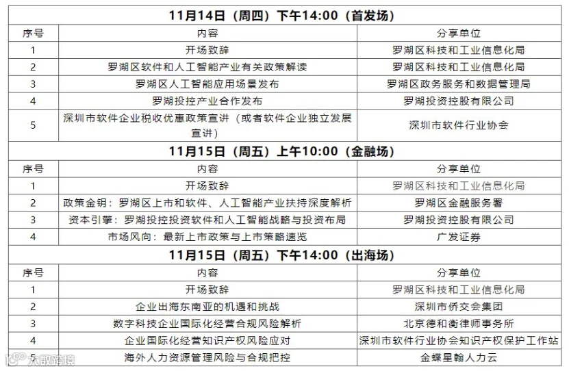 (四)交流促进合作。邀请罗湖区科工局、金融服务署等产业部门,罗湖区政数局等应用场景单位,罗湖投控、广发证券等金融机构,深圳市软件行业协会、侨交会集团、德和衡律师事务所等机构,以及若干软件和人工智能企业齐聚一堂。同期,参会人员亦可前往高交会其他展览和活动互动交流。