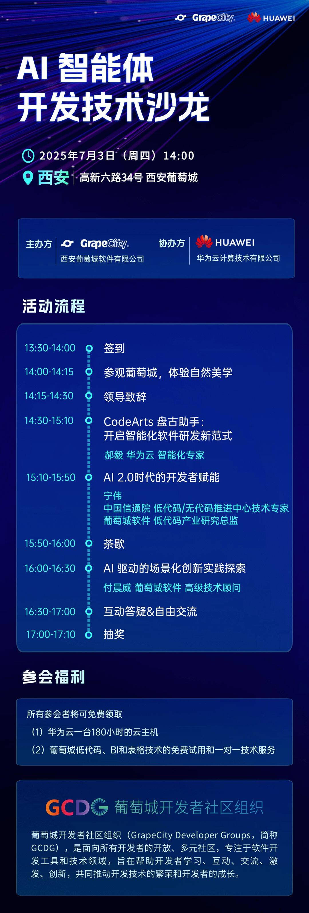 2025 AI 智能体开发技术沙龙,由西安葡萄城软件有限公司主办、华为云计算技术有限公司协办。活动将邀请行业先行者解析 AI 智能体开发技术、探讨 AI+低代码/BI/表格技术场景化解决方案、以领先技术助力行业创新,赋能产业升级。