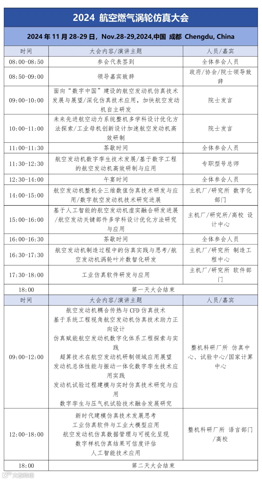 为响应国家科技创新发展战略,推动航空发动机仿真技术发展以促进航空发动机产业数字化战略转型升级,2024航空燃气涡轮仿真大会将于2024年11月28-29日在中国·成都召开。本次大会以“仿真先行,打造数字航空新动能”为主题,专注民用航空发动机研制数字化转型最新技术研究与未来发展趋势,围绕民用航空发动机整机全三维仿真、数字孪生技术、数字主线与数字工程、关键部件多学科设计优化方法、工业仿真软件等热点话题展开分享。来自航空动力科研厂所、高校、技术解决方案供应商、行业学会/协会等300+位嘉宾将出席大会现场,共同推动民用航空发动机研制数字化转型高质量发展。