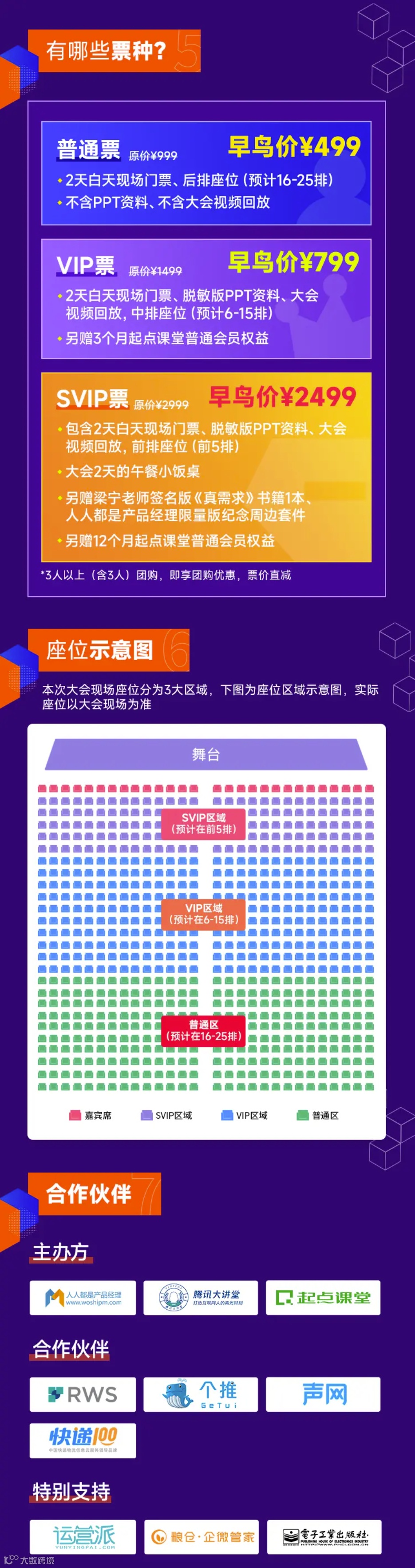 SVIP票:前5排SVIP票,包含2天白天现场门票、脱敏版PPT资料、大会视频回放,包含大会2天的午餐小饭桌,另赠梁宁老师签名版《真需求》书籍1本、人人都是产品经理限量版纪念周边套件、12个月起点课堂普通会员权益