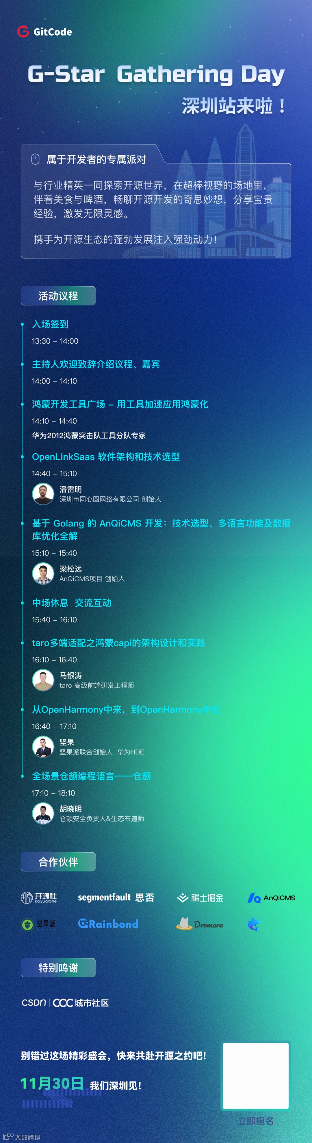 G-Star Gathering Day 是 GitCode 为开源项目开发者打造的面对面聚会。我们准备了View超棒的场地和美食,畅谈开源开发的激情与乐趣,分享经验,激发灵感。这不仅是技术交流盛会,更是开发者们友谊的美好见证,共同为开源生态繁荣贡献力量。