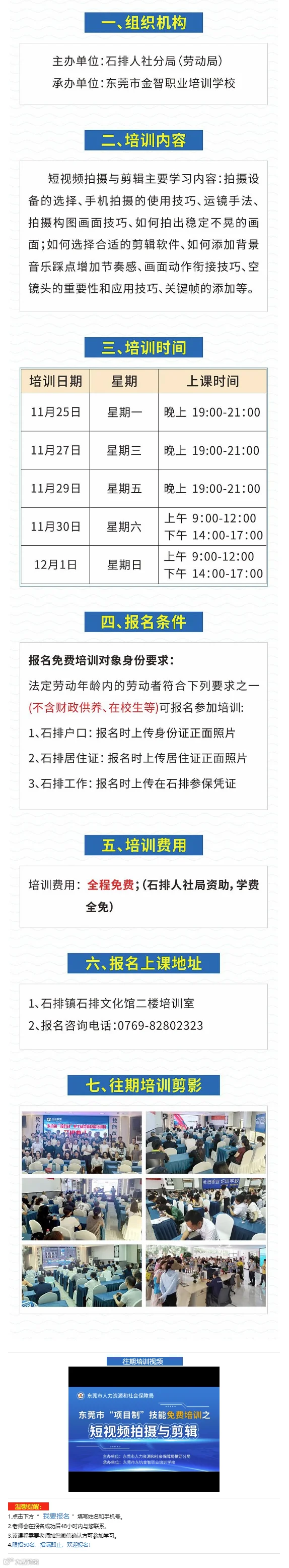 受东莞市人力资源和社会保障局石排分局委托,承办2024年“项目制”电子商务师(短视频拍摄与剪辑)免费培训。