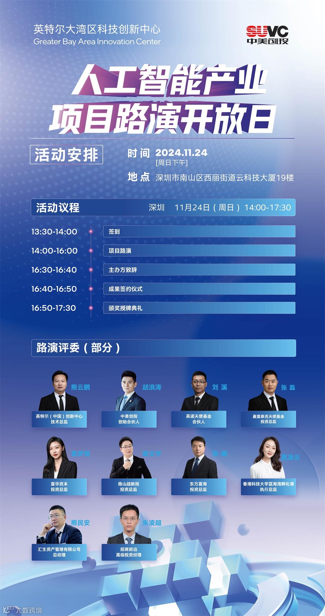 在第三期加速营期间,英特尔大湾区科技创新中心联合中美创投于11月24日下午举办“人工智能产业项目路演”开放日活动,从加速营50家企业中甄选了10余家AI创新企业进行展示。活动当天将邀请中美创投、南山战新投、盈富泰克天使基金、英诺天使基金、富华资本、汇生资产等多家知名投资机构代表,英特尔技术专家以及行业领袖等嘉宾出席。