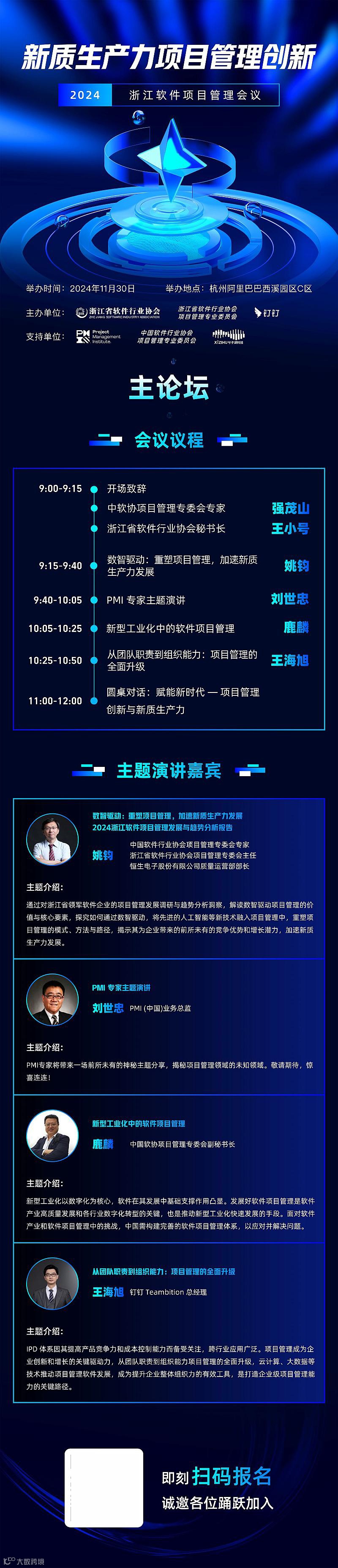 本次会议由浙江省软件行业协会、浙江省软件行业协会项目管理专委会以及钉钉中国信息技术有限公司共同主办,定于2024年11月30日在中国•杭州 阿里巴巴西溪园区C区召开。