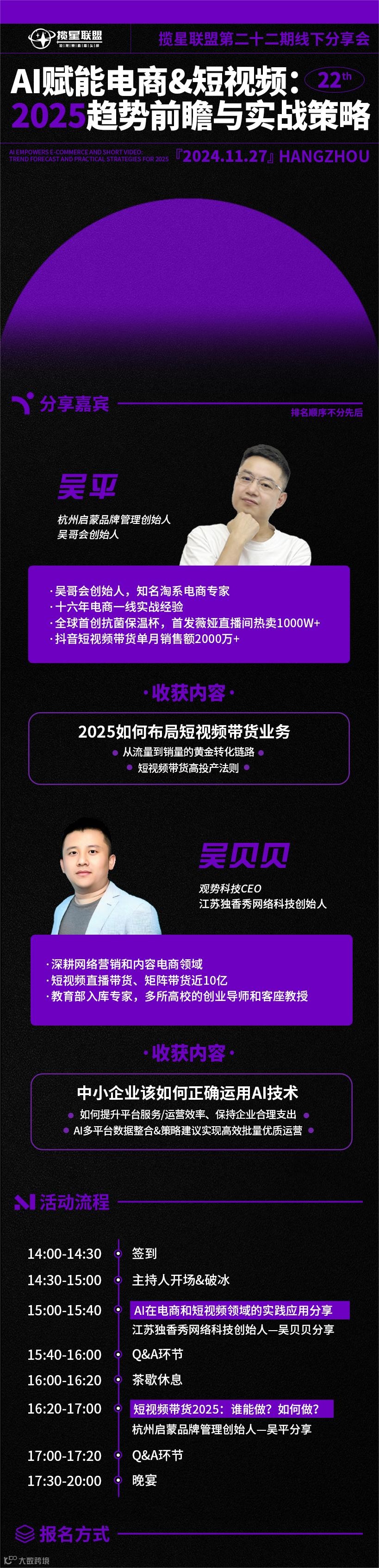 11月27日 14:00 - 20:00 会议+晚宴 「AI赋能的电商&短视频:2025趋势前瞻与实战策略」