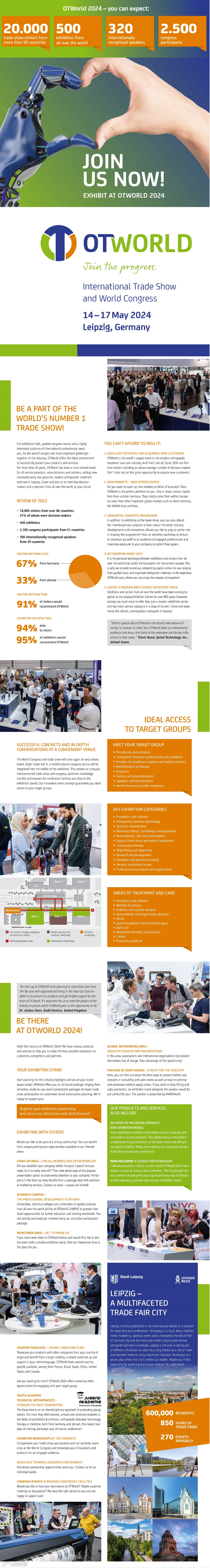 莱比锡假肢和矫形器展览会(OTWORLD)是世界上最大的假肢、矫形器和康复技术展览会。它由来自工业界和科学界的国家和国际合作伙伴(包括服务提供者)共同运作,就像康复团队中的不同学科在病人护理中密切合作一样。