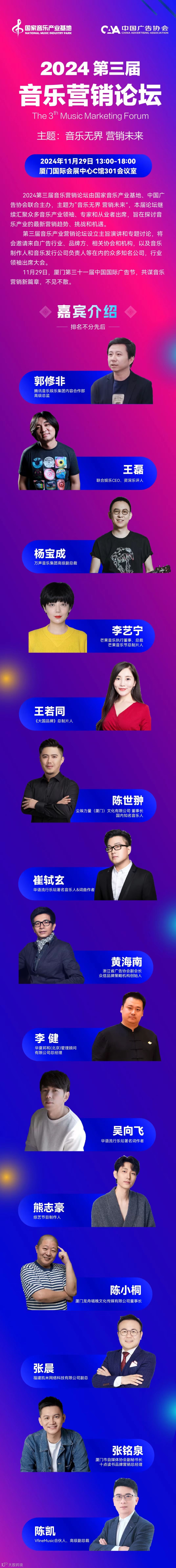 第三届中国音乐营销峰会也将于11月29日下午在厦门同步开幕,继前两届峰会的成功举办,第三届中国音乐营销峰会再次吸引了广告行业、品牌方、相关协会和机构,以及众多音乐人、音乐公司与各平台的积极参与。本次峰会将以“音乐无界,营销未来”为主题,深入探讨音乐与营销的深度融合,以及数字时代下的音乐营销新趋势。