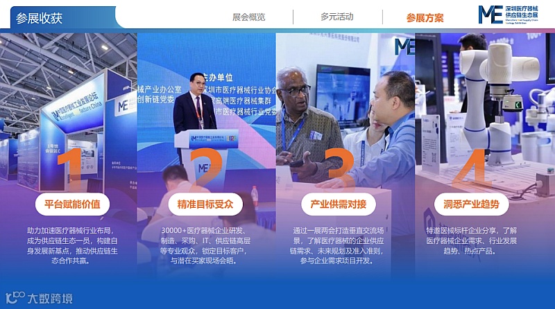 深圳医疗器械供应链生态展(简称ME供应链生态展)由深圳市医药和医疗器械产业办公室指导,深圳市医疗器械行业协会(国家高端医疗器械集群)主办,中国科学院深圳先进技术研究院、国家高性能医疗器械创新中心、中国医学装备协会支持,全国四十余家医疗器械商协学会协办,全面展示医疗器械产业源头创新、研发设计、制造生产直至产品上市全链条所需的核心要素,汇集众多细分领域的领军企业,推动高端制造装备及制造业赋能医疗器械供应链升级,助力我国高端医疗装备加快实现自主可控。
