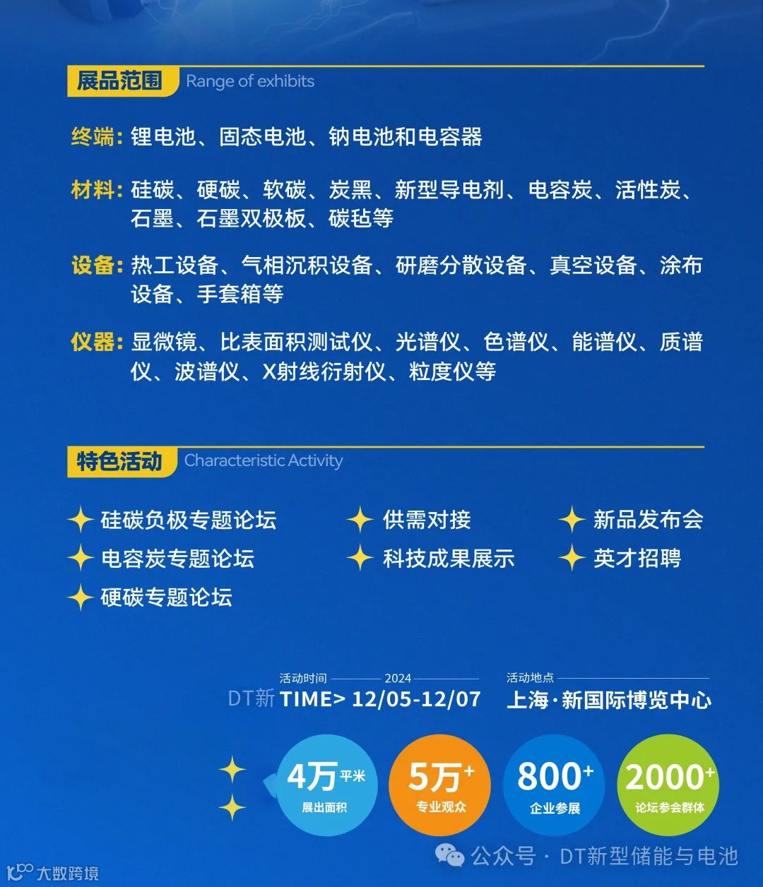 Carbontech2024展览会W2馆绿色能源主题展馆涉及硅碳、硬碳、电容炭、石墨等电极材料,石墨烯、碳纳米管、导电炭黑等导电剂添加材料;石墨双极板、碳毡、碳催化剂材料、碳气凝胶和衍生碳材料;碳纤维/碳纤维复合材料、碳/碳复合材料、复材制品,以及涉及碳材料和新能源应用相关的生产加工设备、检测设备、科学仪器,同时包含碳陶制动部件、新能源汽车结构件 、回收技术与设备;科研成果展示。