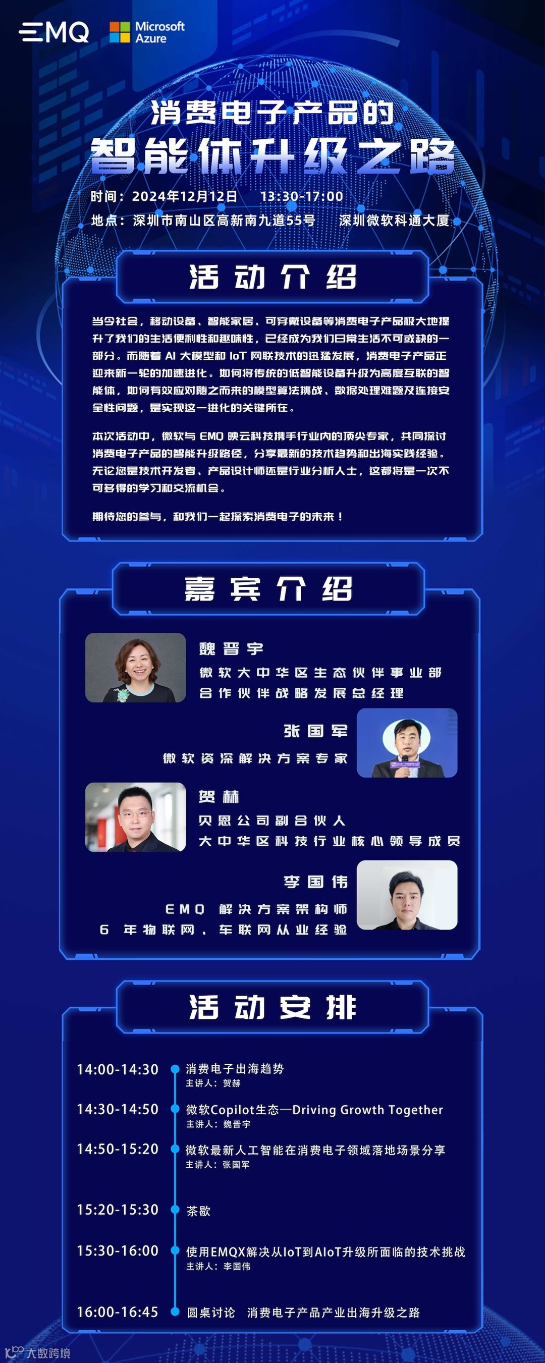 本次活动中,微软云 Azure 与 EMQ 映云科技携手行业内的顶尖专家,共同探讨消费电子产品的智能升级路径,分享最新的技术趋势和实践经验。无论您是技术开发者、产品设计师还是行业分析人士,这都将是一次不可多得的学习和交流机会。