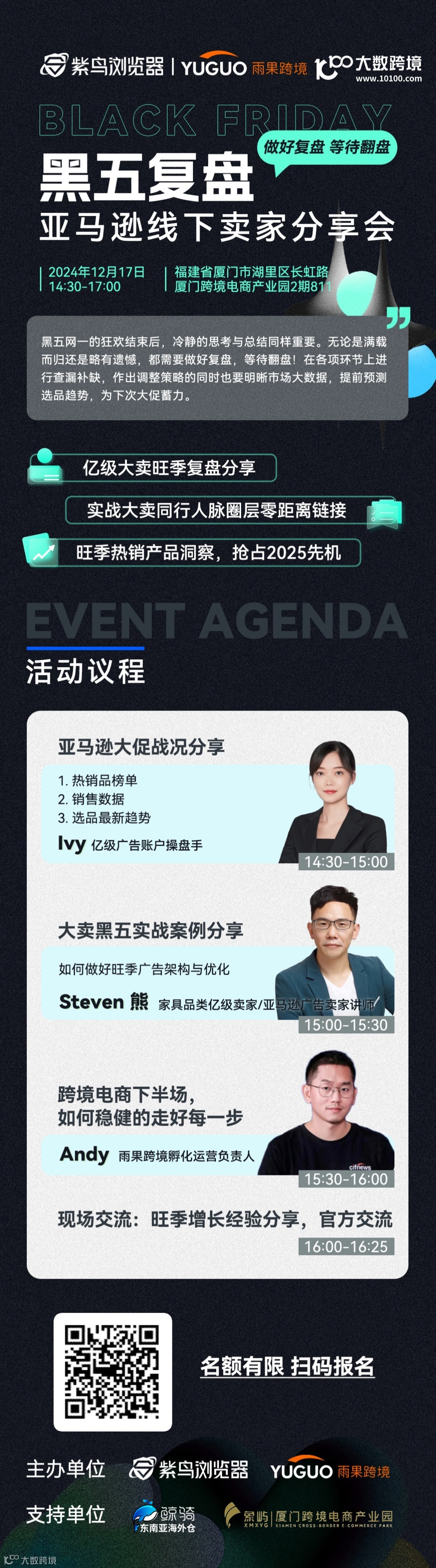 活动亮点:● 亿级大卖旺季复盘分享● 实战大卖同行人脉圈层零距离链接● 旺季热销产品洞察,抢占2025先机
