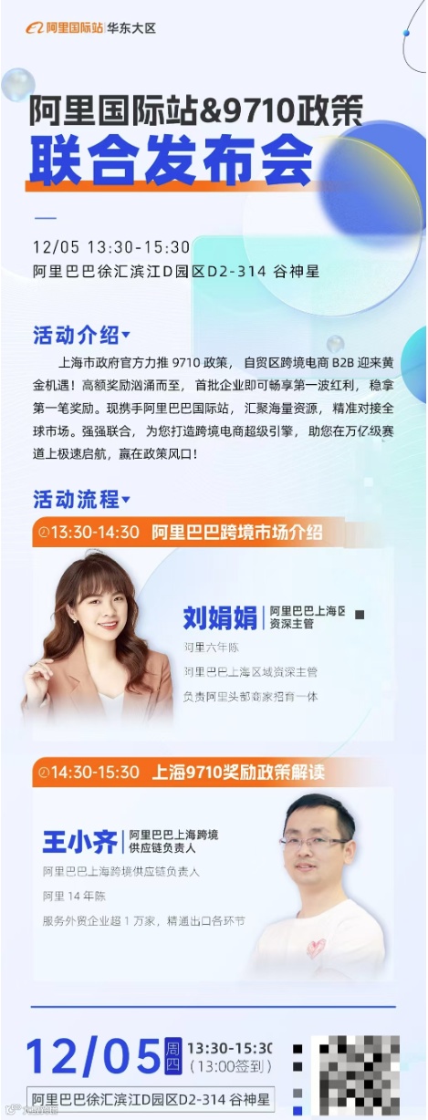 国际站&浦东政府9710联合发布会将在12月5日下午alibaba徐汇园区D区开展,讲解9710政策及做外贸可以拿到的红利资源,名额有限。