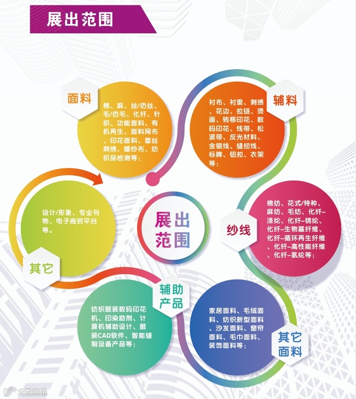 面料:棉、麻、丝/仿丝、毛/仿毛、化纤、针织、功能面料、有机再生面料、网布、印花面料、蕾丝刺绣、婚纱布、纺织品检测等;