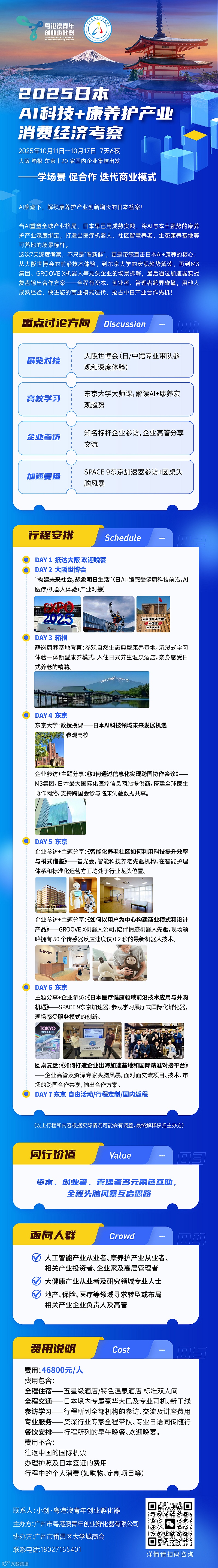 💡 现在,粤港澳青年创业孵化器邀你7天深度解码:2025日本AI科技+康养护产业消费经济考察(10.11-10.17,大阪→箱根→东京,7天6夜)本次活动由粤港澳青年创业孵化器主办,带你直击 AI+康养核心场景,用日企的成熟经验,迭代你的商业模式,抢占中日产业合作先机!