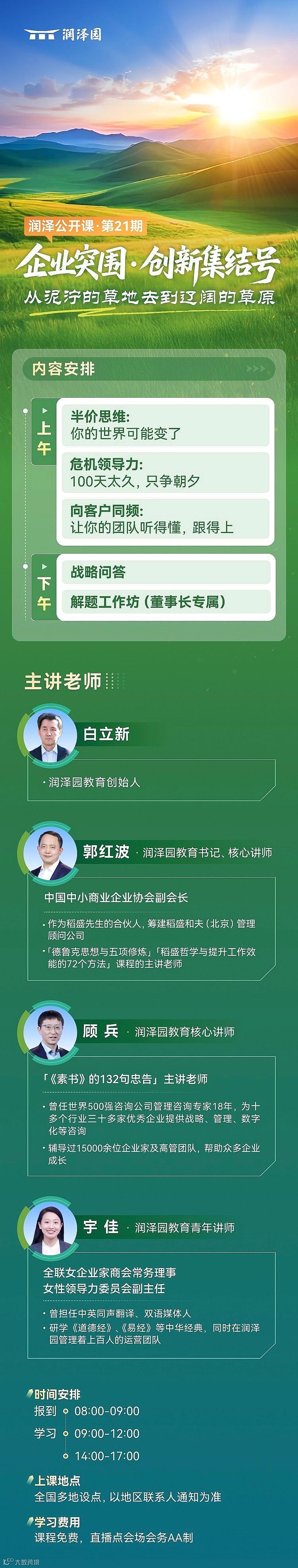 告别空谈,直击本质!润泽公开课带您打通泥泞到草原的光亮,开启我们的破局之旅!孟子有云:“天时不如地利,地利不如人和”,10月10日(周五),我们一起找到“人和”的起点——以客户为本,通过解决客户真难题,同步激活团队真心力,实现 “在奔跑中突破”。