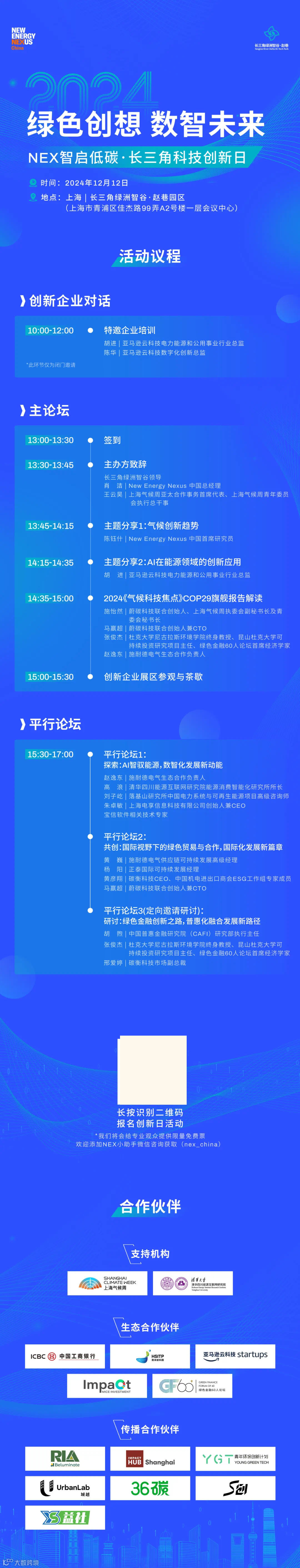 在全球碳中和的浪潮中,如何用科技解锁绿色增长的新机遇?2024年12月12日,New Energy Nexus(NEX)将携手长三角绿洲智谷·赵巷园区,举办“绿色创想 数智未来——2024 NEX智启低碳·长三角科技创新日”。