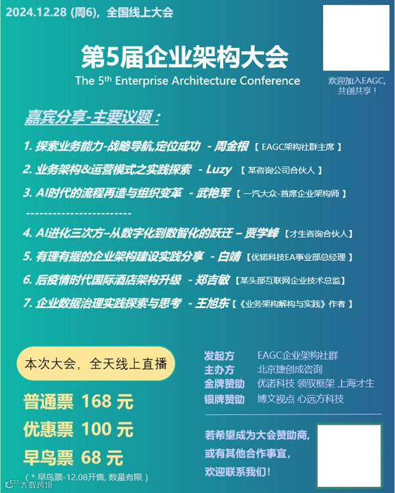 2024.12.28日(周6),随着AI与企业架构的推广,EAGC架构社群即将举办第五届企业架构全国线上大会,