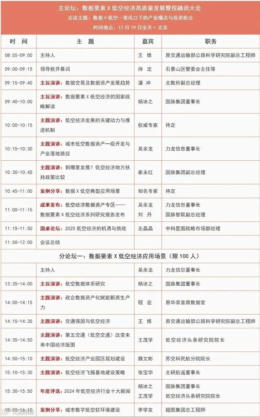为此,由中关村科技园区石景山园管理委员会指导,北京国际大数据交易所、数据(数字)资产流通创新中心、石景山数据产业生态矩阵、中国交通运输协会投融资分会联合主办,北京国脉智联网络有限公司等承办的“数据要素X低空经济高质量发展暨投融资大会”将于12月19日在北京召开,大会以“数据×低空—双风口下的产业爆点与投资机会”为主题,将邀请国家发改委、工信部、交通部、民航局、行业专家、投融次机构、低空经济产业园区、企业、行业协会与联盟等开展深入探讨、交流与合作,涵盖最新政策权威解读、产业趋势洞察、实践案例分享等,将奉上干货满满、注重实践、富有获得感的高品质、风向标专业会议,期待您的智慧点亮现场,您的方案惊艳同行!诚挚邀请您拨冗莅临,共享数字经济和低空经济最新成果和发展商机!