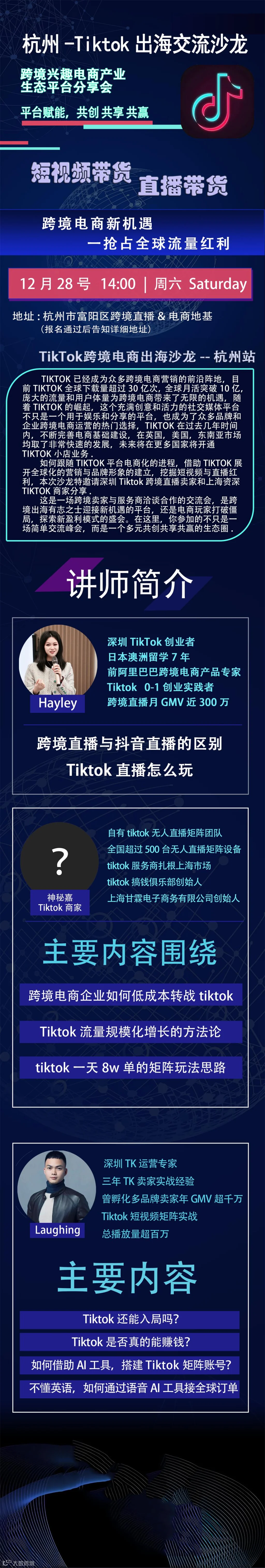杭州首次Tiktok跨境直播和短视频带货线下沙龙来了,详情请看群里邀请函: