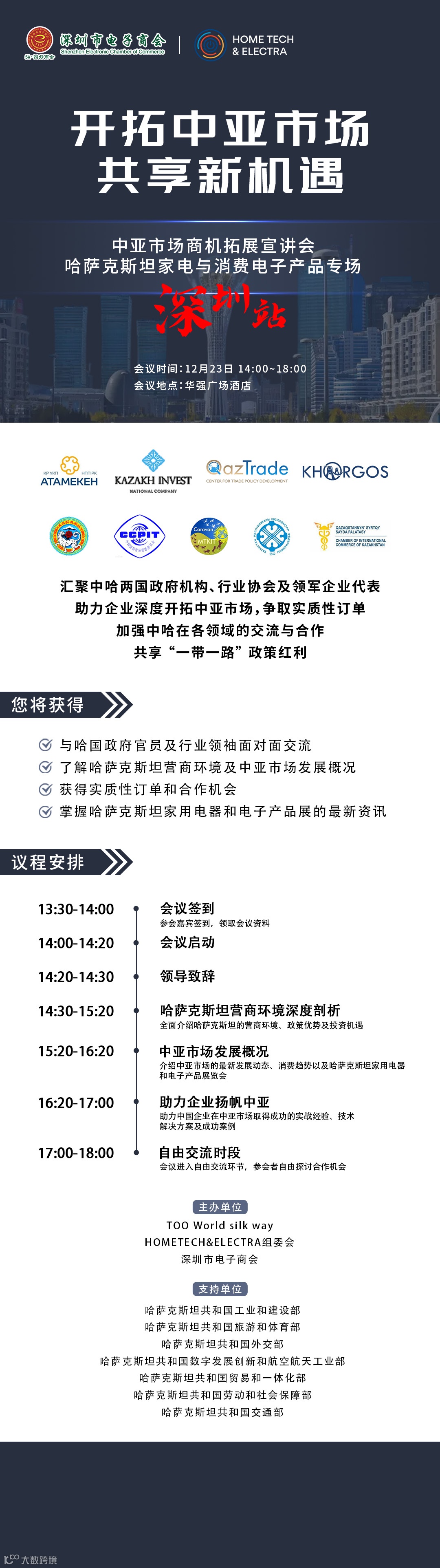 为促进中哈之间的经贸合作,为双方企业提供更多的合作机会,共同开拓新的市场,实现互利共赢。深圳市电子商会特举办中亚市场商机拓展宣讲会,具体活动安排如下: