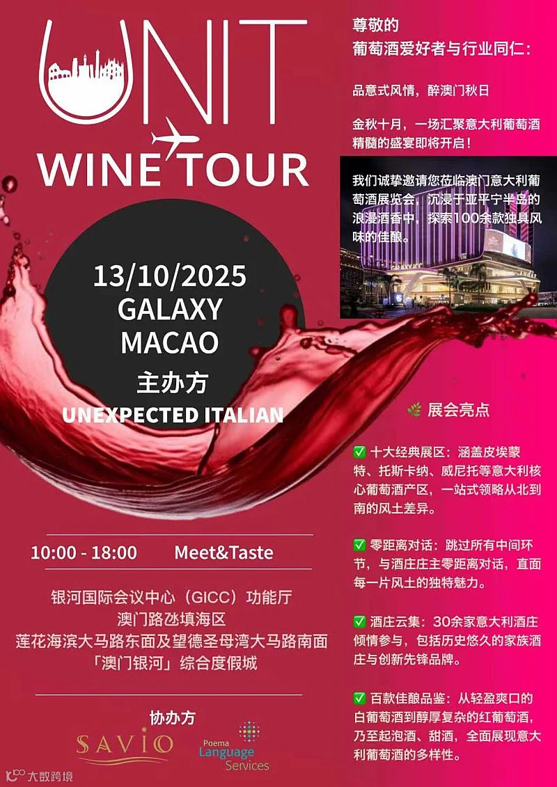 尊敬的葡萄酒爱好者与行业同仁: 金秋十月,一场汇聚意大利葡萄酒精髓的盛宴即将开启!我们诚挚邀请您莅临澳门意大利葡萄酒展览会,沉浸于亚平宁半岛的浪漫酒香中,探索100余款独具风味的佳酿。 三个主题,三种色彩,共同编织出意大利葡萄酒的华丽图谱。 无论您是资深藏家、行业专业人士还是爱好者,本次展会都将是一次难忘的意式风味之旅。 让我们一同举杯、沉浸于意大利的酿造艺术之中! 🌿 展会亮点: ✅ 十大经典展区:涵盖皮埃蒙特、托斯卡纳、威尼托等意大利核心葡萄酒产区,一站式领略从北到南的风土差异。 ✅ 名庄云集:30余家意大利知名酒庄倾情参与,包括历史悠久的家族酒庄与创新先锋品牌。 ✅ 百款佳酿品鉴:从轻盈爽口的白葡萄酒到醇厚复杂的红葡萄酒,乃至起泡酒、甜酒,全面展现意大利葡萄酒的多样性。 ✅ 零距离对话:跳过所有中间环节,与酒庄庄主零距离接触,直面每一片风土的独特魅力。 📅 日期:2025年10月13日(周一) ⏰ 时间:上午10:00 - 下午18:00 📍 地点:澳门银河国际会议中心二楼功能厅(路氹城澳门银河综合度假城内) 🎟 参与方式: 请填写”我要报名“,用以登记。 无论是葡萄酒收藏家、行业专业人士,还是单纯热爱生活的品酒爱好者,这都是一场不可错过的意式风味之旅。让我们举杯相遇,共鉴意大利人的酿造智慧与浪漫激情! 主办方:UNEXPECTED ITALIAN 🍇 品意式风情,醉澳门秋日!期待与您相约! 🥂
