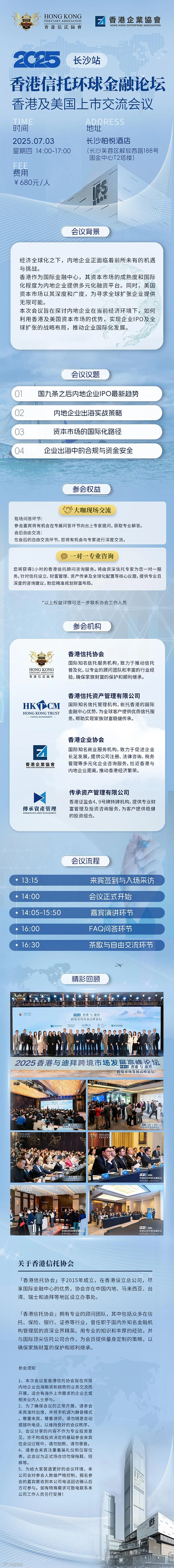 2025香港信托环球金融论坛 - 聚焦港美上市新机遇!由香港信托协会主办、香港企业协会协办的权威巡讲——“香港及美国上市交流会议”,自今年1月起已重磅登陆北京、上海、深圳、济宁,场场反响热烈!下月即将启航长沙!把握港美资本市场前沿动态,聆听权威解读与实战经验分享。助力企业布局全球资本之路!
