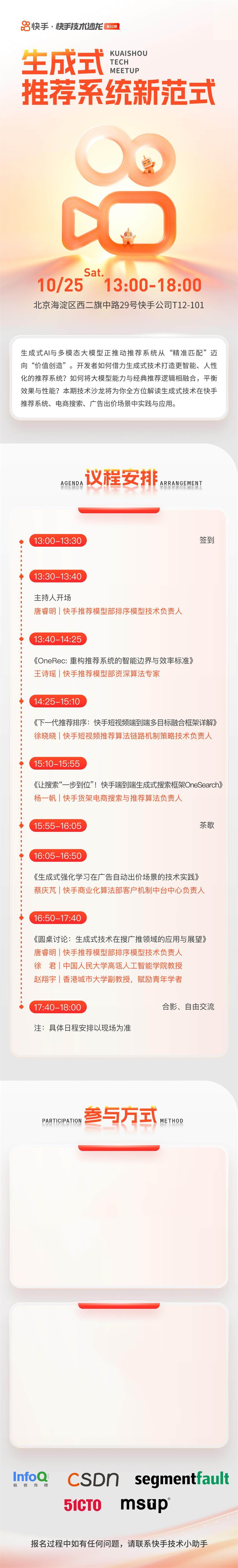 从推荐、搜索到广告出价,议程覆盖了互联网核心业务的三大场景,由快手一线技术专家层层剖析,完整呈现生成式技术如何从底层逻辑、模型架构到应用框架,推动推荐系统从“精准匹配”迈向“具有推理与创造能力的价值创造”新阶段