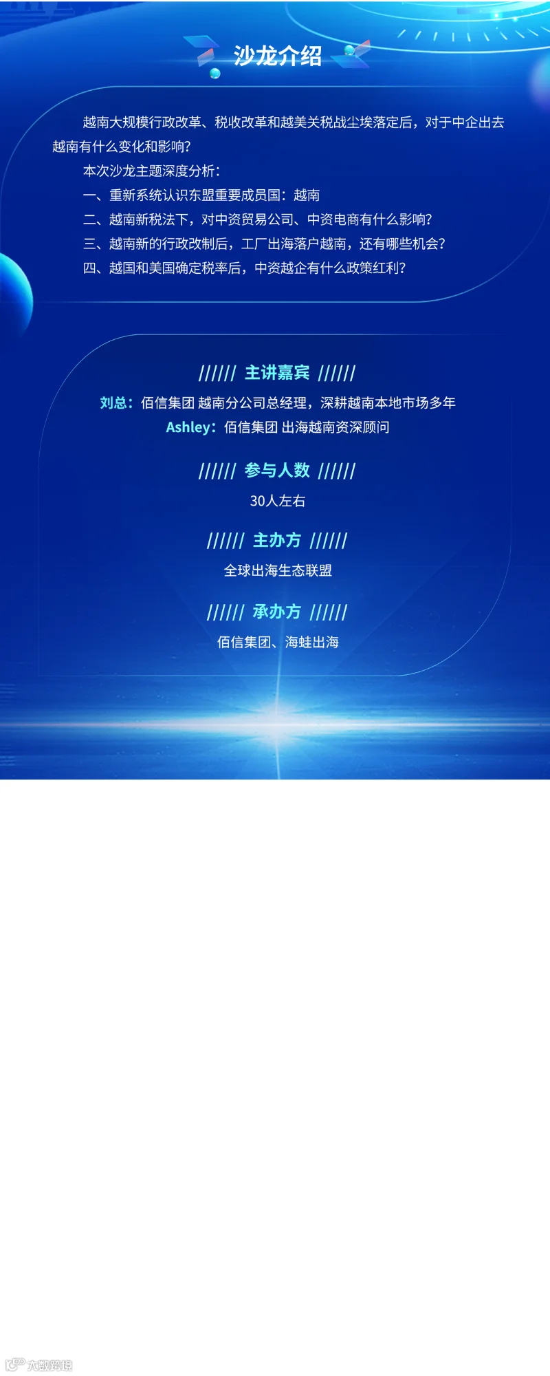 此外,中企出海越南也面临巨大的挑战。比如,新关税的冲击,转口贸易关税大幅提升,还有用工成本和土地租金的上升压力。资新形势下资中企出海越南,如何应对挑战,的抓住机遇呢?欢迎报名本次沙龙,共探共享,共创共赢!定税率后,中资越企有什么政策红利?